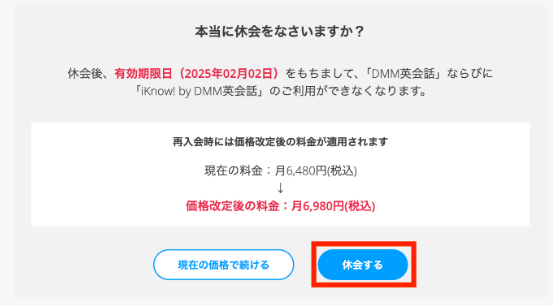 • 休会:アカウントや学習履歴は残して休止する(休会中は一切料金発生しない)。手続きは楽。