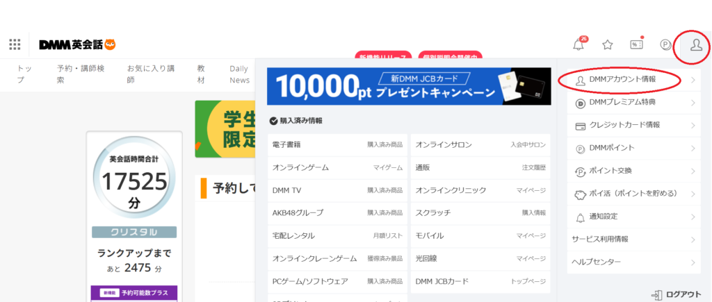 ①DMM英会話にログインし、画面右上の人型アイコン→『DMMアカウント情報』をクリック。