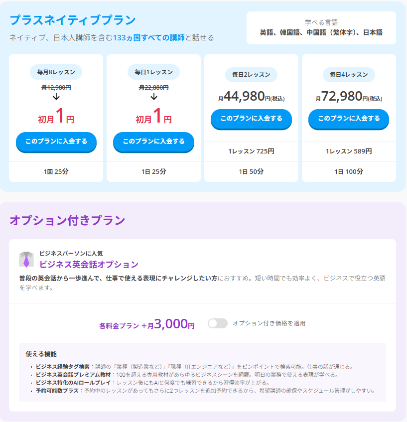 - プラスネイティブプラン:ネイティブや日本人講師も含む133か国の講師とレッスン可能だが料金は高め。
