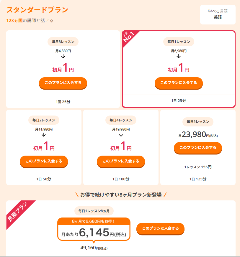 スタンダードプラン(毎日1レッスン)は月額6,980円、つまり1日あたり約233円でレッスンできる計算。