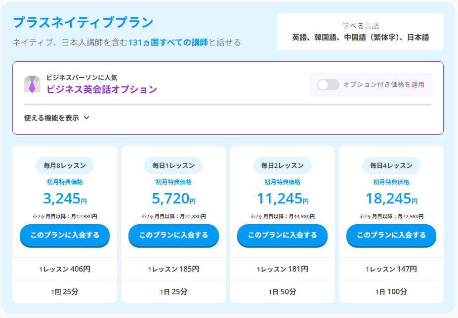 • プラスネイティブプラン:ネイティブや日本人講師も含む133か国の講師とレッスン可能だが料金は高め。