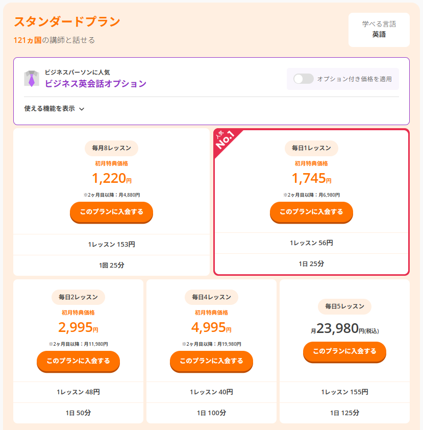 スタンダードプラン(毎日1レッスン)は月額6,980円、つまり1日あたり約233円でレッスンできる計算。